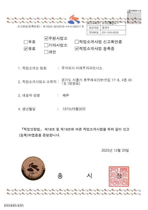 당사는 「직업안정법」에 따라 유료 직업소개업 법인 등록을 정식으로 완료한 기업으로, 외국인 근로자 채용 및 인력 중개 업무를 합법적이고 투명한 절차에 따라 수행하고 있습니다. 유료 직업소개업 등록을 통해 외국인 근로자 초청, 해외 송출기관과의 협업, 국내 고용주 연계를 포함한 인력 관련 서비스 전반을 법적 요건에 부합하게 운영하고 있습니다.