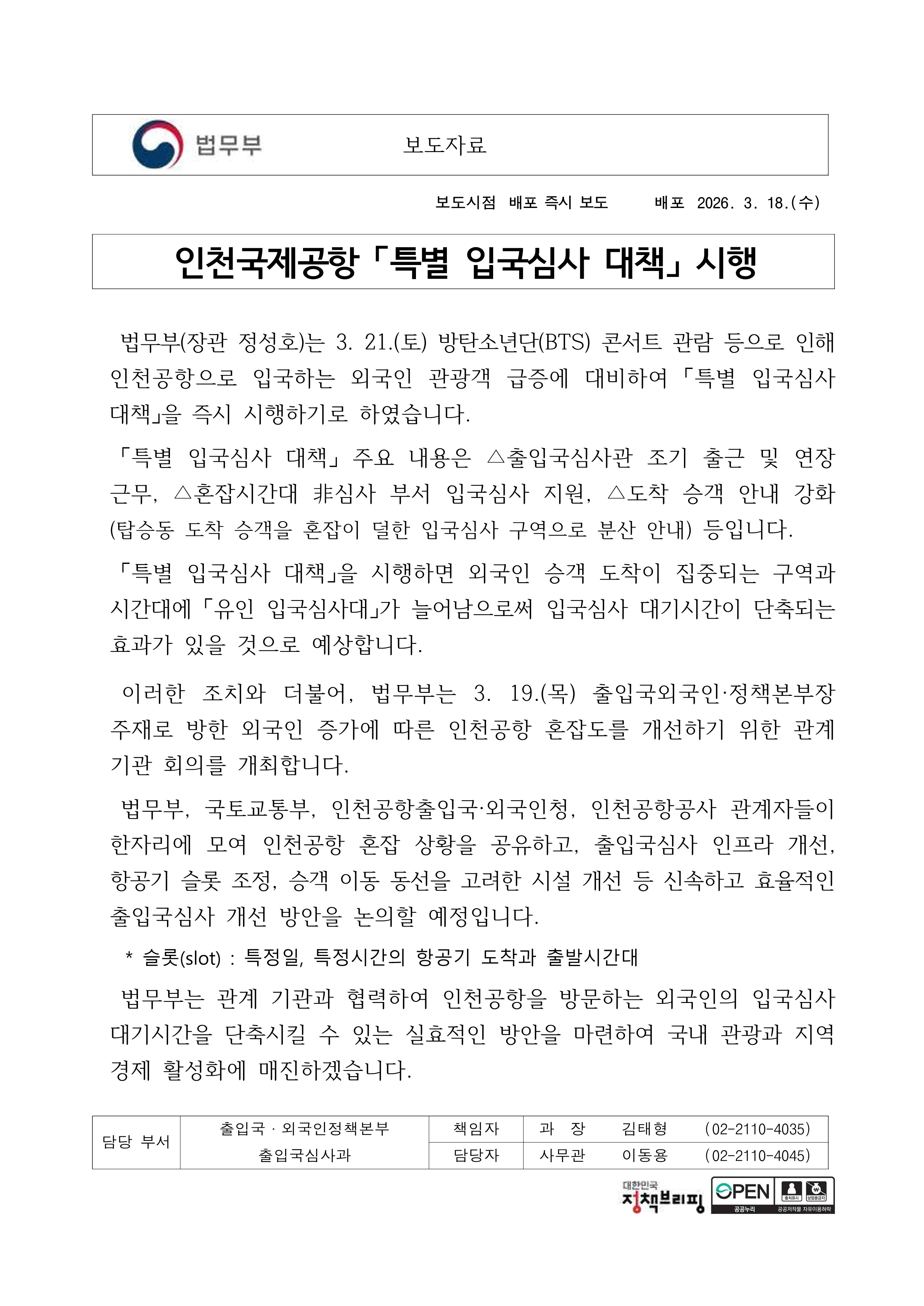 법무부는 2026년 3월 21일 방탄소년단(BTS) 콘서트 등으로 인한 외국인 입국 증가에 대응하기 위해 인천국제공항에 ‘특별 입국심사 대책’을 시행한다고 밝혔다. 이번 조치는 입국 혼잡 완화와 대기시간 단축을 목표로 한다.